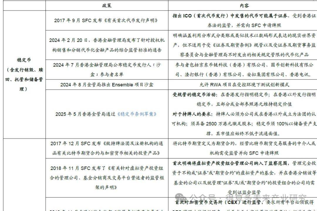 全面开放阶段(2022年至今):2022年开始逐步放开加密货币的交易,通过开放散户市场、完善稳定币立法及RWA试点,吸引全球资本涌入。自2023年6月实施新VASP制度,允许交易所向零售投资者提供服务,要求提供加密资产服务的机构除了持有传统证券行业的牌照外,还需申请加密资产服务商牌照;2024年加密货币现货ETF获批,华夏基金、南方东英等机构推出BTC/ETH ETF,管理规模超50亿港元;2024年8月金管局推出Ensemble监管沙盒,允许RWA项目在受控环境下测试创新模式,如太极资本房地产基金证券型代币发行(STO)、蚂蚁数科与朗新集团的充电桩收益权上链融资等;2025年《稳定币条例草案》构建了一个稳定币的具体框架,受规管的稳定币活动有在香港发行指明稳定币和在香港以外发行指明稳定币,且部分或全部参照港元维持稳定价值。对于持牌人也提出要求,持牌人必须为公司或在香港以外成立为法团的认可机构;须具备2500万港元缴足股本;稳定币须100%以储备资产支撑,其市值应始终不低于流通面值。《稳定币条例草案》主要聚焦于现货交易领域,未明确开放稳定币衍生品交易。