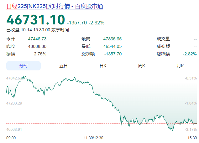 14日午后,日经指数跌幅一度超过3%,并成为亚太市场跌幅最大的主要股指。软银一度跌5.8%,索尼及日立一度跌3.5%及4%。