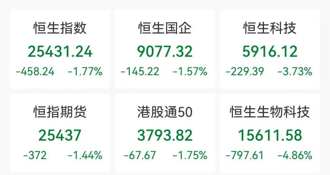 香港股指亦全线走弱,截至收盘,恒生科技指数跌超3%,恒指亦跌超1.7%。