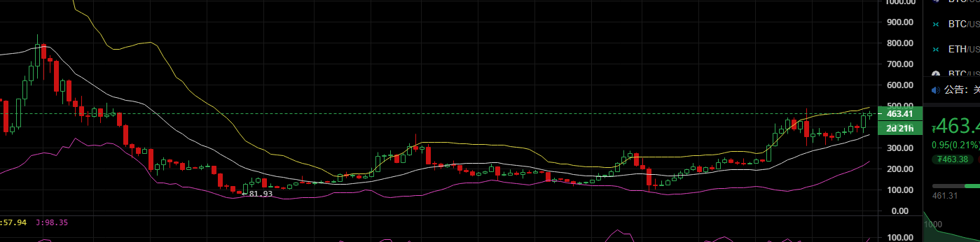 再来看看以太坊,目前以太的价格463附近,也就是18年7月份的压力,只要突破这个区间以太坊还能再创新高到600多问题不大,别看以太坊还差200点,币圈疯起来可不是闹着玩的,不说半年 半个月都有可能达到。再来看看短线 以太的头肩顶形态下破颈线,却逆势上涨,这样的诱空动作后市往往带来上涨。下方支撑461.7,上方压力467.7,477.7。