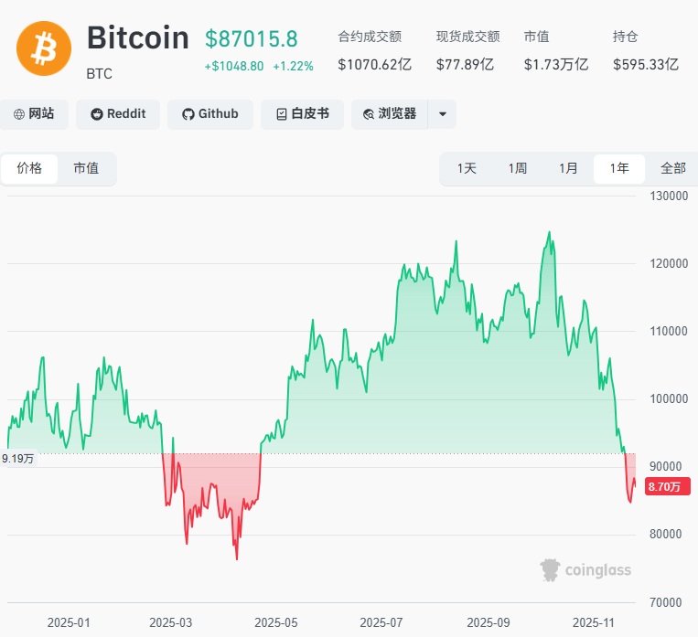 值得注意的是,比特币价格从10月初约12.5万美元的峰值,一度暴跌低至8万美元附近,跌幅达35%,这导致加密市场总市值蒸发约1万亿美元,抹掉年初以来所有涨幅。