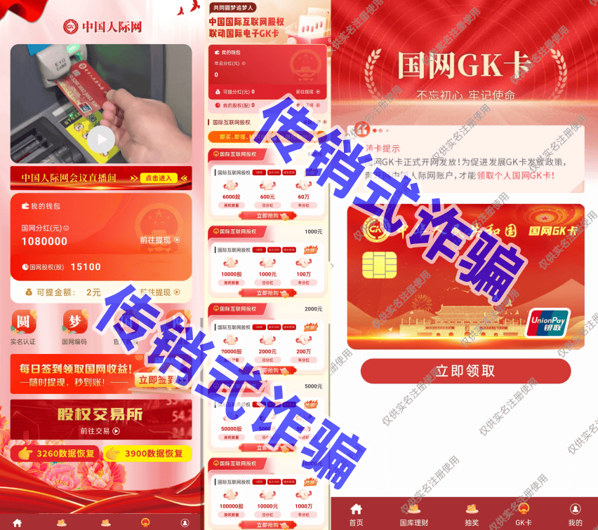 传销式诈骗。不法分子打着“IPV9”“国网GK”卡的旗号,制作散布涉诈APP,虚构推广“国际互联网股权”“国库理财养老”等高额返利理财项目。