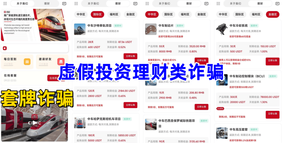 虚假理财诈骗。不法分子冒充“中国中车”公司的名义,制作散布涉诈APP,虚构推广“中车制动片”“中车印尼电动车组项目”“中车冷却系统”“中车高压套管”等高额返利理财项目。