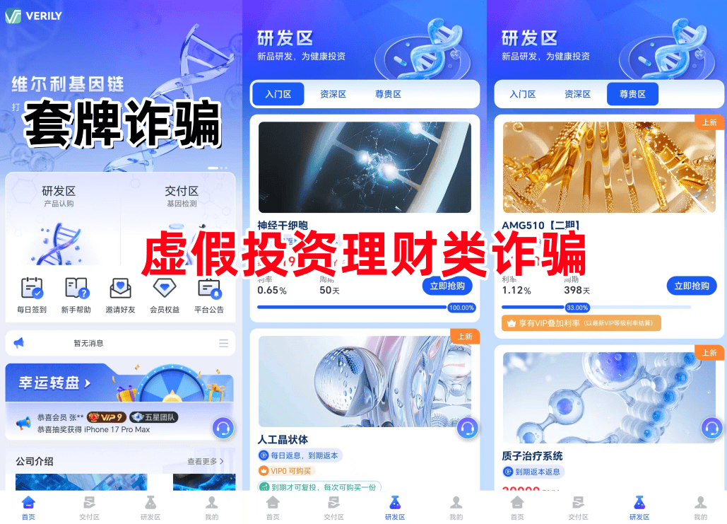 虚假理财诈骗。不法分子冒充香港某公司的名义,制作散布涉诈APP,虚构推广“气管插管稳定系统”“卡马替尼”“神经干细胞”“普拉替尼”等高额返利理财项目。