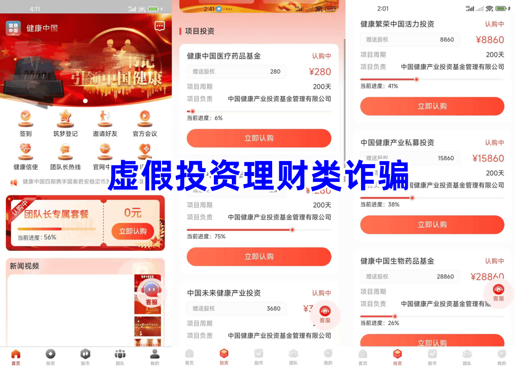 虚假理财诈骗。不法分子冒充“国泰君安”公司的名义,制作散布涉诈APP,虚构推广“健康中国医疗药品基金”“健康中国医疗科技投资”“中国未来健康产业投资”“中国健康产业私募投资”等高额返利理财项目。