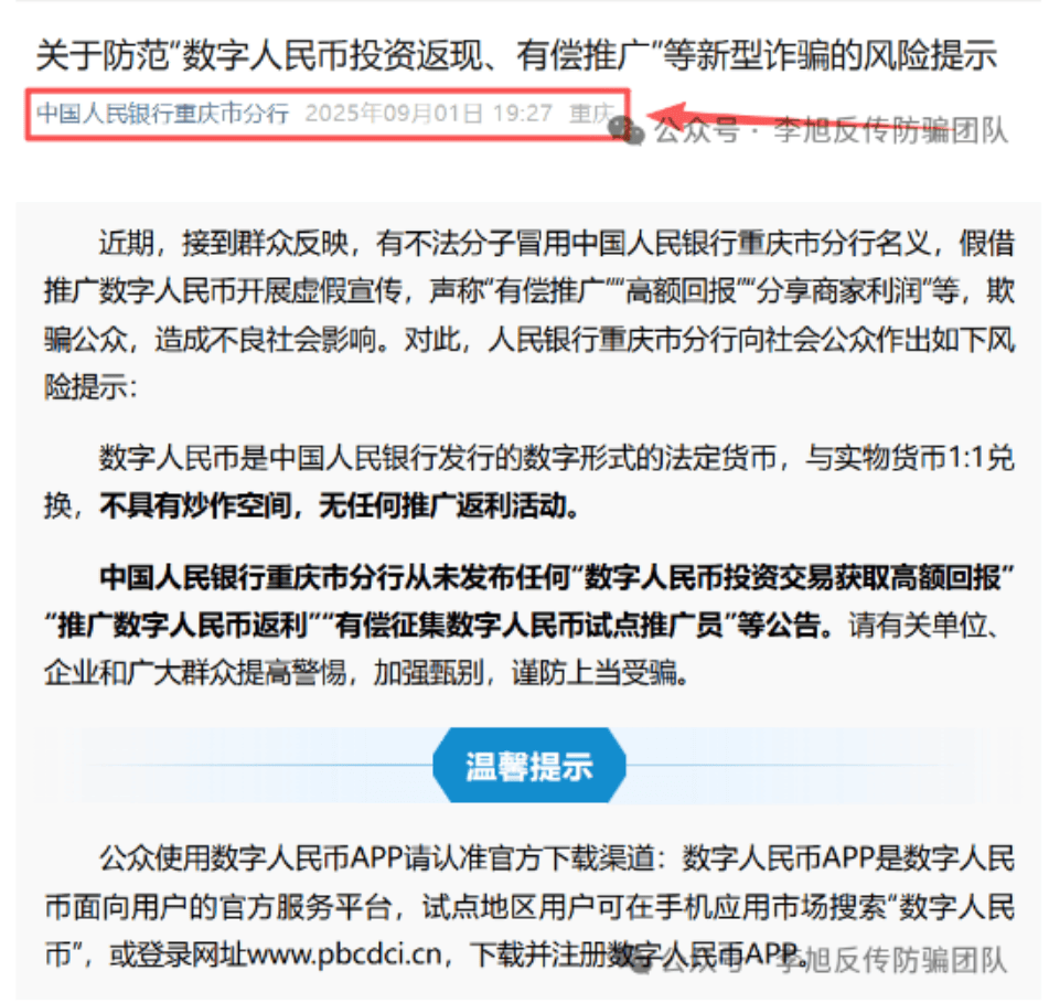 2025年9月,“人民银行重庆分行”公众号发布《关于防范“数字人民币投资返现、有偿推广”等新型诈骗的风险提示》。风险提示中明确提到:数字人民币不具有炒作空间,无任何推广返利活动。警惕“数字人民币投资获取高额回报”、“有偿推广员”等骗局。(点击↓图阅读全文)