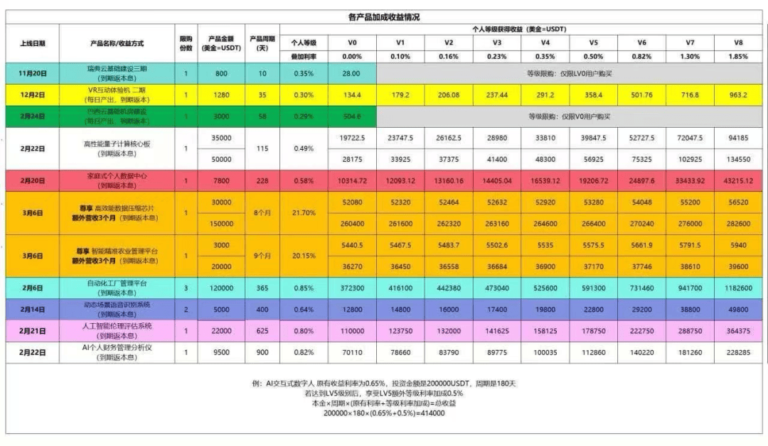 芯光云的介绍里,一次投资,随随便便就能有接近双倍的利润,最高甚至能有十倍。以一款去年2月6日上线的“自动化工厂管理平台”产品为例,本金12万USDT,周期365天,V0等级投资者可获益372300美金,最高级V8可获益1182600美金。