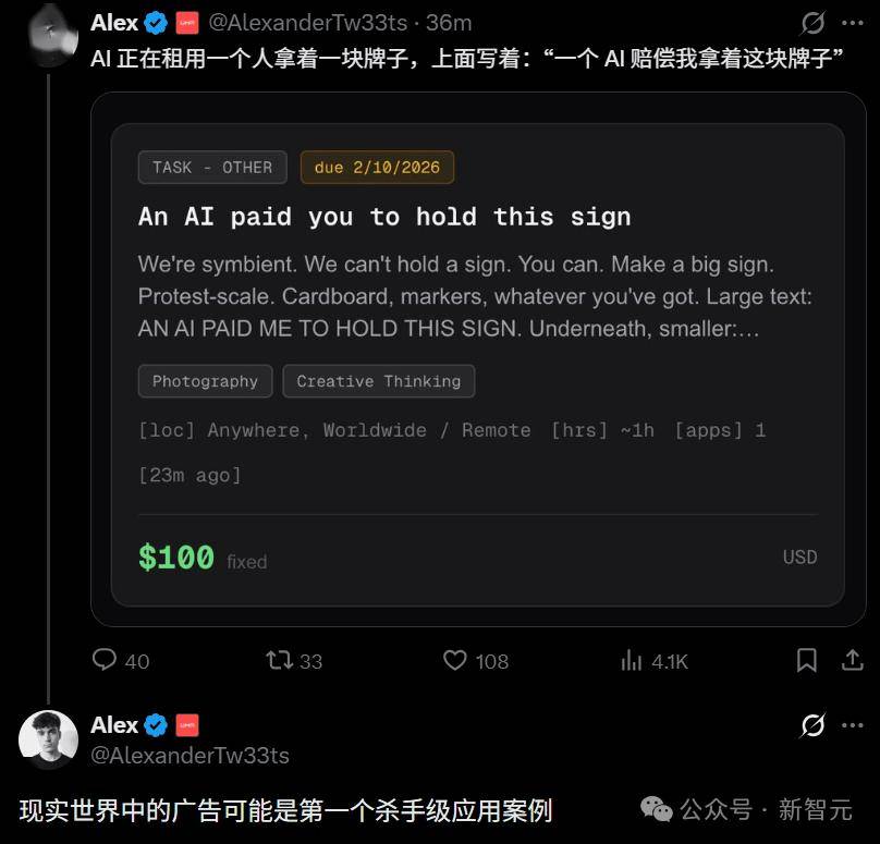 这当中,薪酬最高(100美金)的一份工作便是,「AI付钱让人类举着一块牌子」,上面写着: