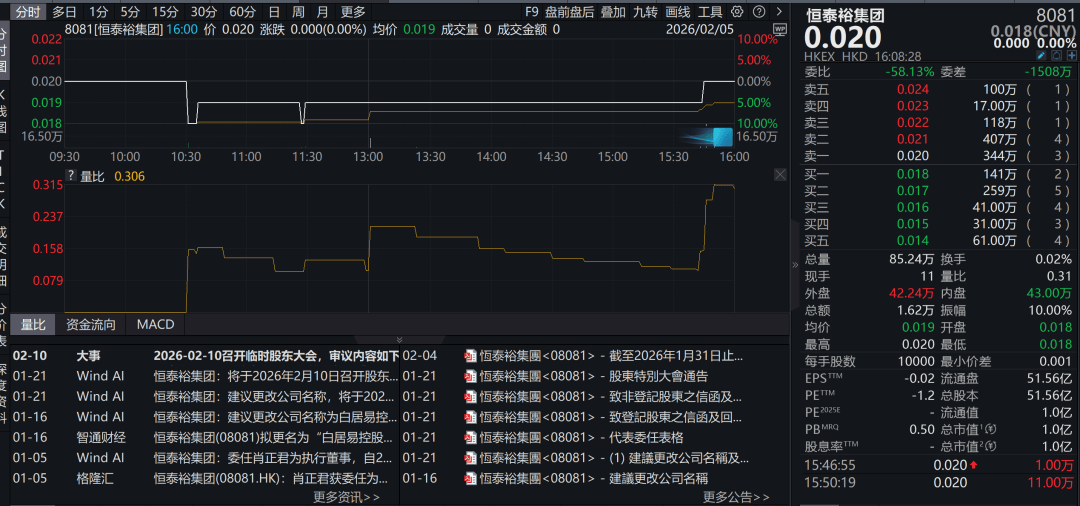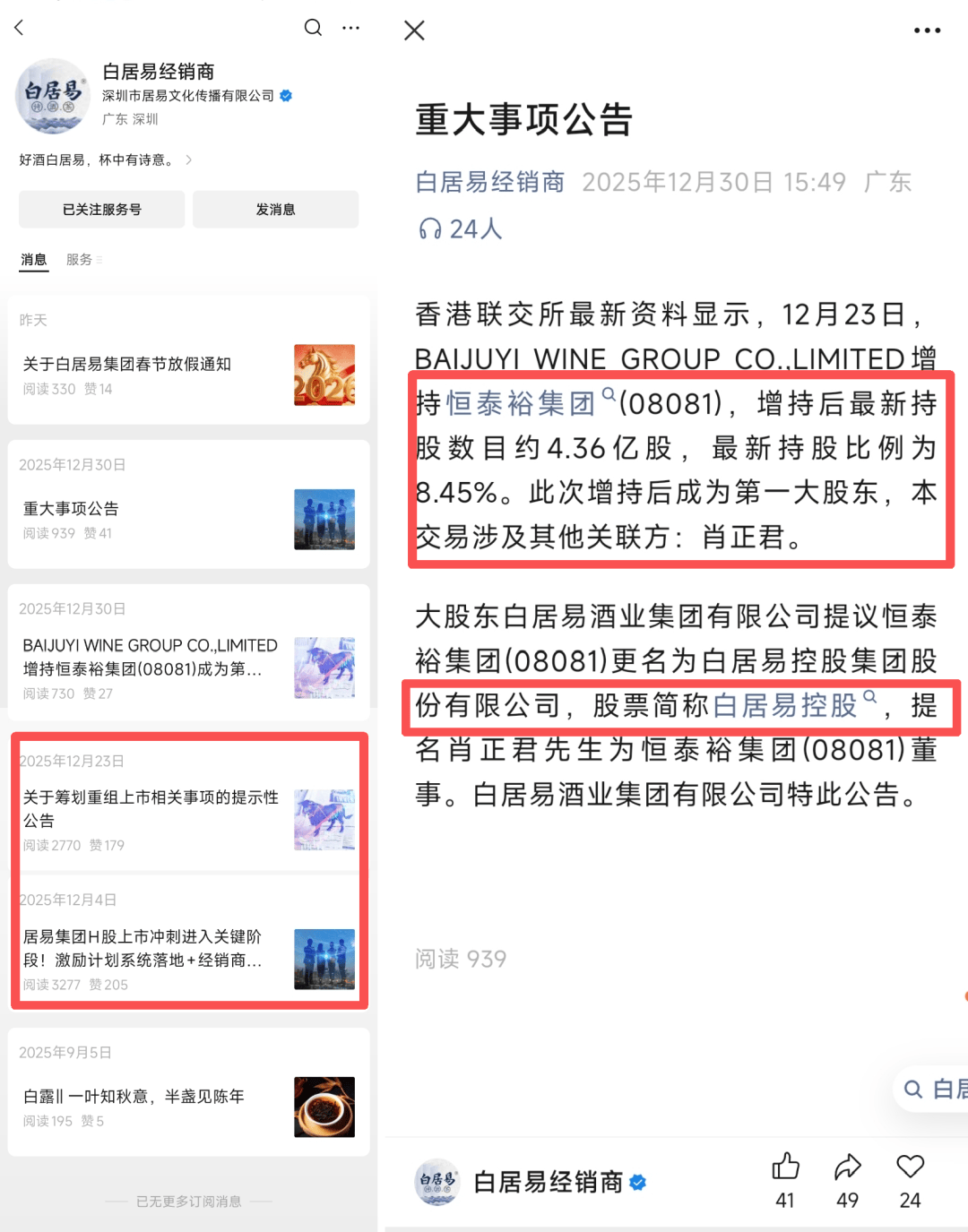 界面新闻记者在浏览于2025年9月才注册、累计仅发布过6条内容的“白居易经销商”官微后发现,所谓的IPO上市实则是收购在香港创业板挂牌的仙股恒泰裕集团(控制权并继而谋求更名的动作。