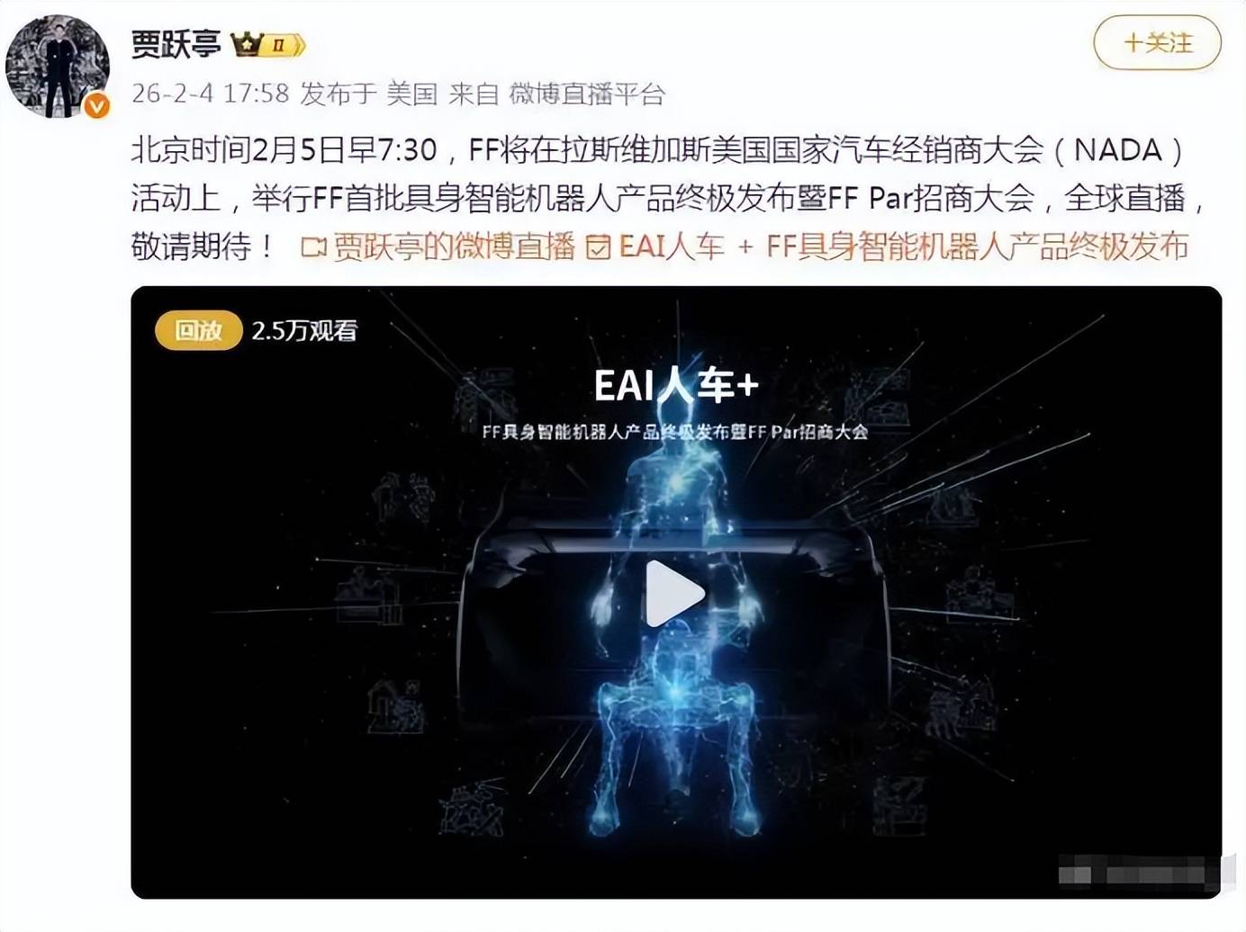 2月5日,贾跃亭依旧顶着法拉第未来创始人的头衔,在美国拉斯维加斯国家汽车经销商大会上高调亮相,这场大会本是汽车行业的主场,他却剑走偏锋,发布了三款所谓的巨神智能机器人。